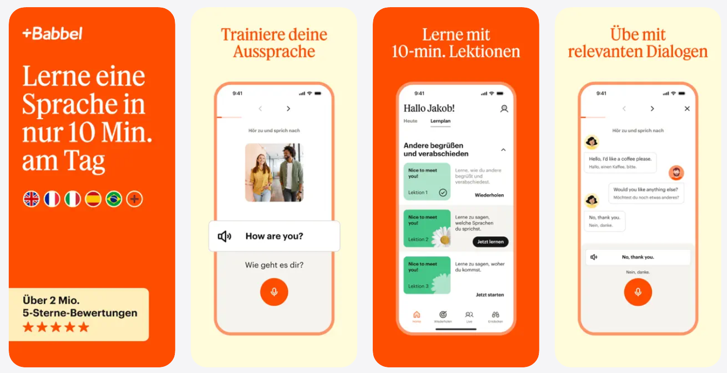Babbel richtet sich an Erwachsene und bietet strukturierte Kurse für Alltagssituationen.